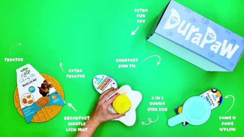 Get your pup's tail wagging with a DuraPaw box delivered straight to your door. This month brings a brand new theme overflowing with breakfast surprises! We're talking waffles, squeaky eggs, and puzzles packed with pawsome treats. Sign up today and join the pack of happy, well-fueled pups!