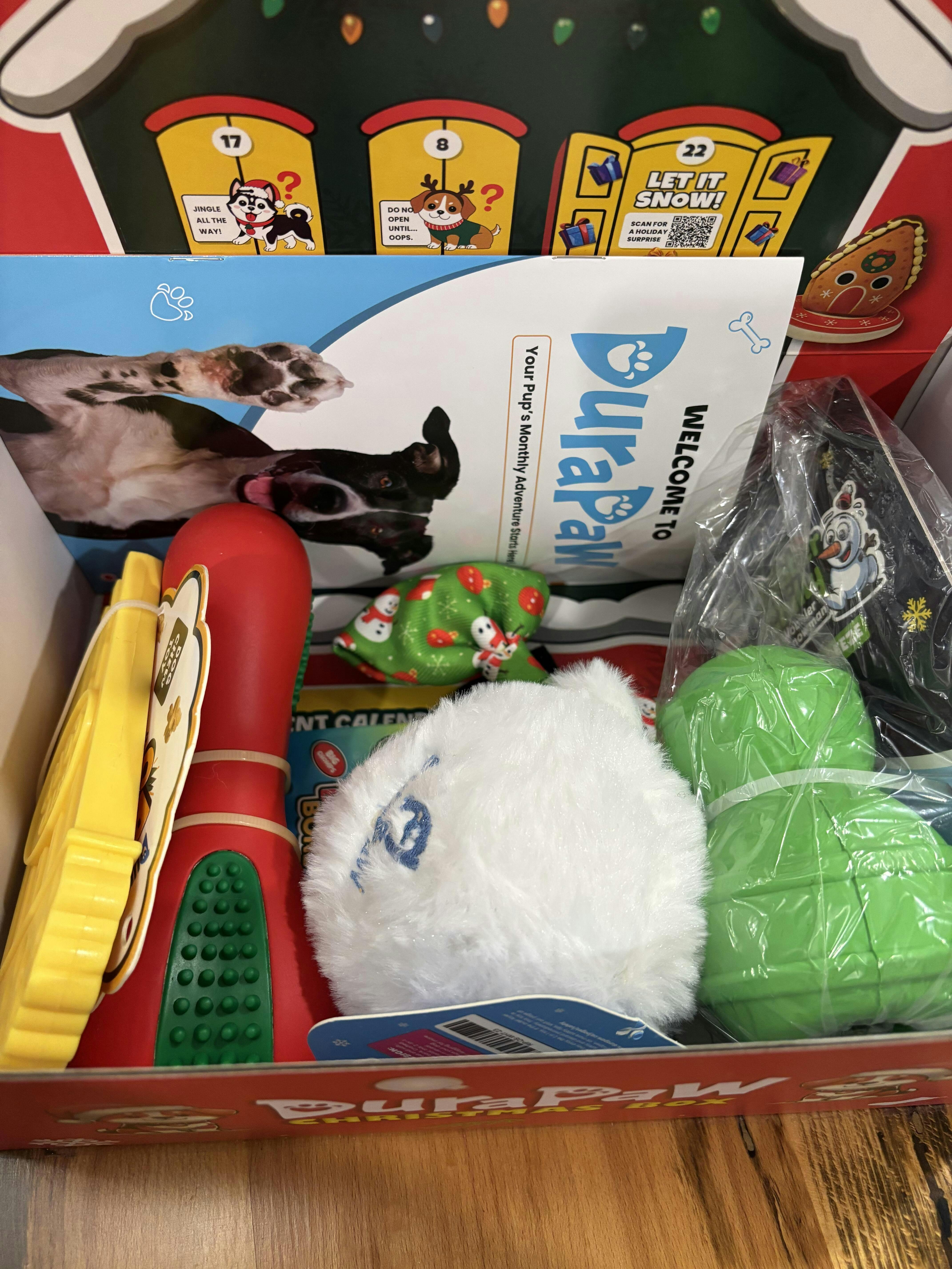 My dogs love the last festive box, the crinkly bendable bone is so cool, my dog hasn't put it down since he got it, carries it everywhere, and it holds up to his constant chewing so far. The Christmas bow tie is darling. Everything in the box was a hit. Thanks 😊