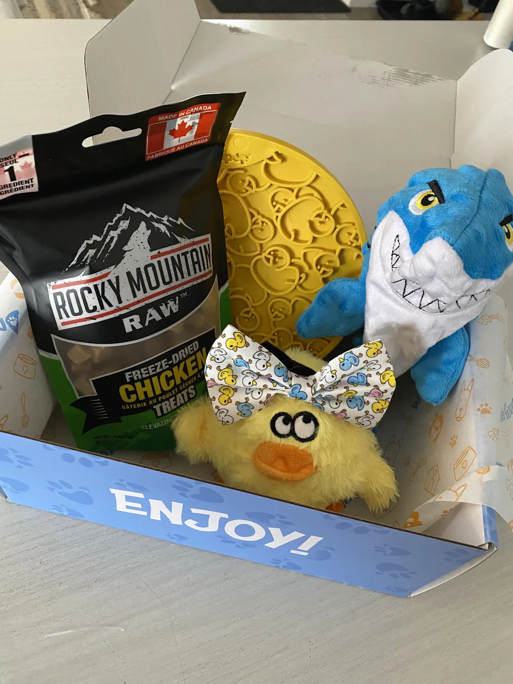 Each box comes brimming with 3-4 enriching dog toys, delicious Canadian-made treats, and a fun customized wearable accessory.